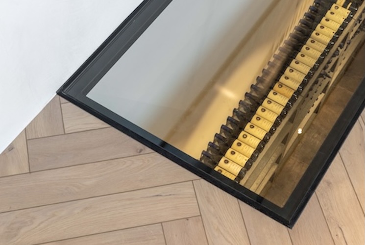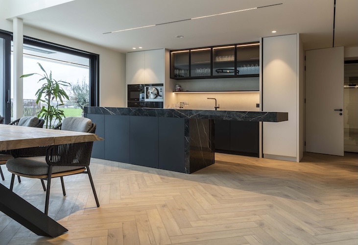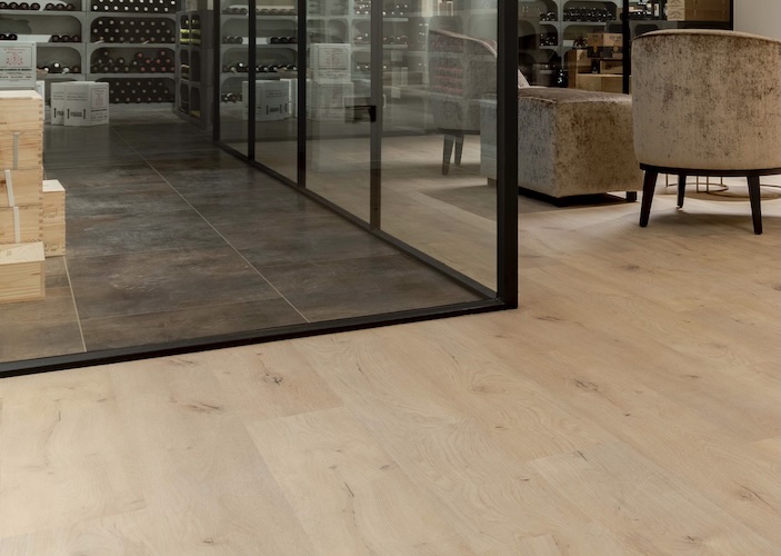 Barbara Wantens ; “We kozen voor drie verschillende stijlen: lange planken, visgraat en tegels – allemaal van Coretec®. In de woonkamer legden we visgraat en integreerden we ook een glazen luik die binnenkijkt in de wijncollectie op de benedenverdieping. Want die verdiende zijn eigen ruimte. In de wijnkelder kozen we voor een tegel, omdat die wat krachtiger toont en zorgt voor een mooie afscheiding met de rest van de benedenverdieping. Naast die wijncollectie creëerden we dan een zithoek om vrienden en familie te ontvangen. Daar kozen we dan voor planken zodat de aandacht naar de wijncollectie gaat. Ook hier heeft het onderhoudsgemak van Coretec® zich bewezen.” lacht Barbara. “Voor wijnvlekken op onze vloer hebben we geen schrik meer.”