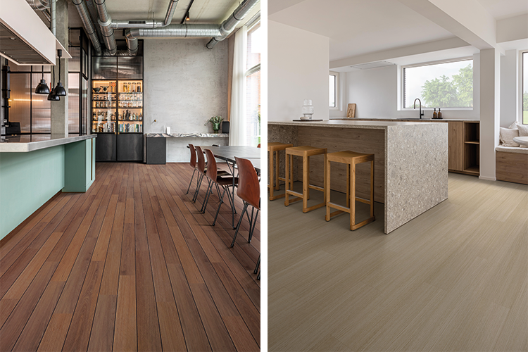 Hierboven vind je een comfortlaag (voor een stille en warme vloer) en de decorlaag die niet te onderscheiden is van echt hout of steen.