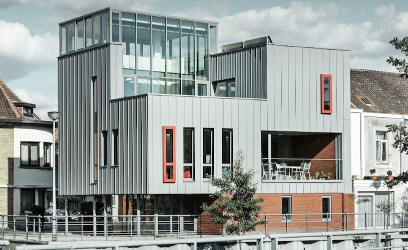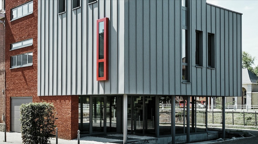 Dit moderne woon- en kantoorgebouw ligt direct aan een klein riviertje en overtuigt visueel door zijn strakke vormentaal en de verticale felsgevel van PREFALZ. De aluminium gevel in de kleur patinagrijs sluit harmonieus aan op de rode baksteengevel en is bovendien bijzonder robuust en duurzaam.