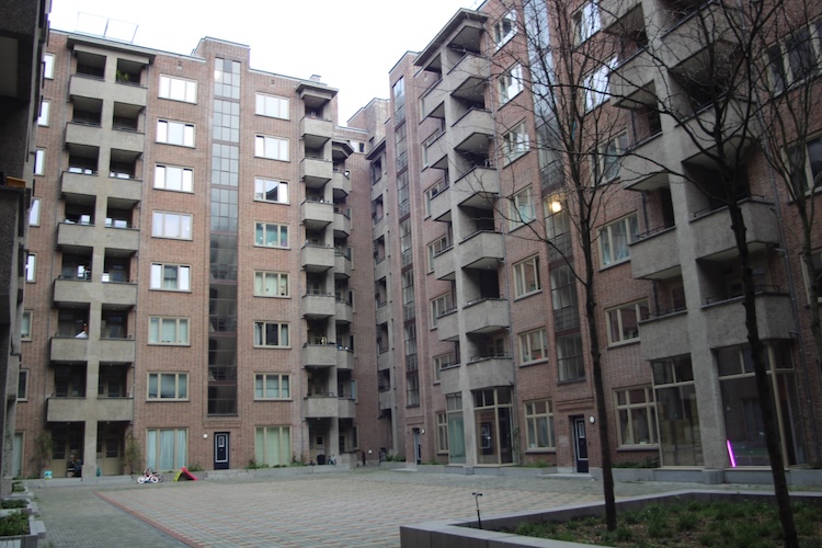 Voor de nieuwbouw is gebruik gemaakt van hetzelfde materialenpallet als voor de bestaande blokken. Zo is de gevel, boven de hardstenen plint, geheel opgetrokken in de roodpaarse baksteen die eenzelfde uitzicht heeft als de roodpaarse geveltegels die ook werden gebruikt om de winkelwoningen op de onderste verdiepingen te accentueren.