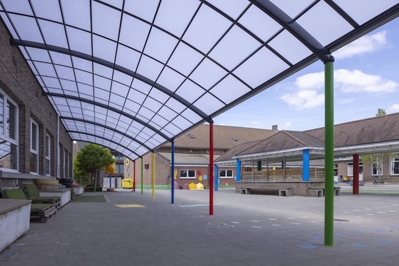 Een speelse poederlakafwerking in verschillende RAL‑kleuren van de ronde palen versterkt het vrolijke karakter van de speelplaats en zorgt voor een uitnodigende omgeving voor de kinderen. Voor de dakbedekking werd gekozen voor massief polycarbonaat in zonwerende uitvoering.