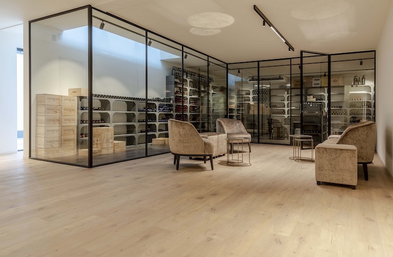 Barbara Wantens ; “We kozen voor drie verschillende stijlen: lange planken, visgraat en tegels – allemaal van Coretec®. In de woonkamer legden we visgraat en integreerden we ook een glazen luik die binnenkijkt in de wijncollectie op de benedenverdieping. Want die verdiende zijn eigen ruimte. In de wijnkelder kozen we voor een tegel, omdat die wat krachtiger toont en zorgt voor een mooie afscheiding met de rest van de benedenverdieping. Naast die wijncollectie creëerden we dan een zithoek om vrienden en familie te ontvangen. Daar kozen we dan voor planken zodat de aandacht naar de wijncollectie gaat. Ook hier heeft het onderhoudsgemak van Coretec® zich bewezen.” lacht Barbara. “Voor wijnvlekken op onze vloer hebben we geen schrik meer.”