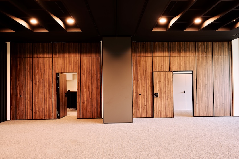 Voor de grote seminariezaal plaatste FDS zeven mobiele akoestische wanden type Sonico 100 met: